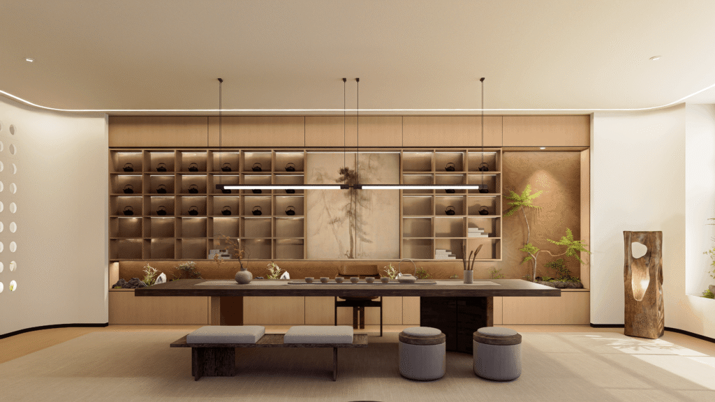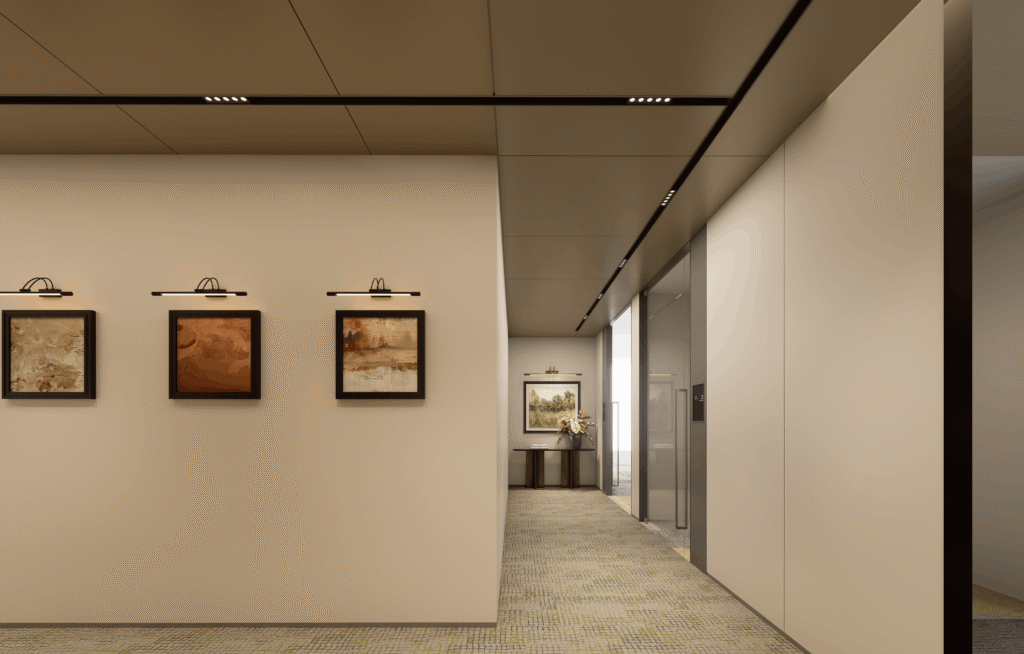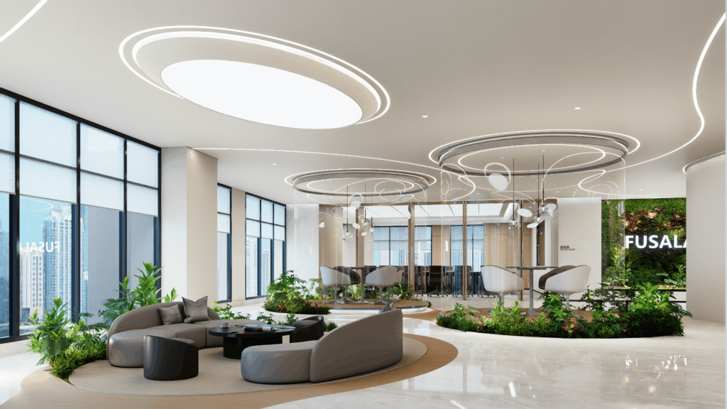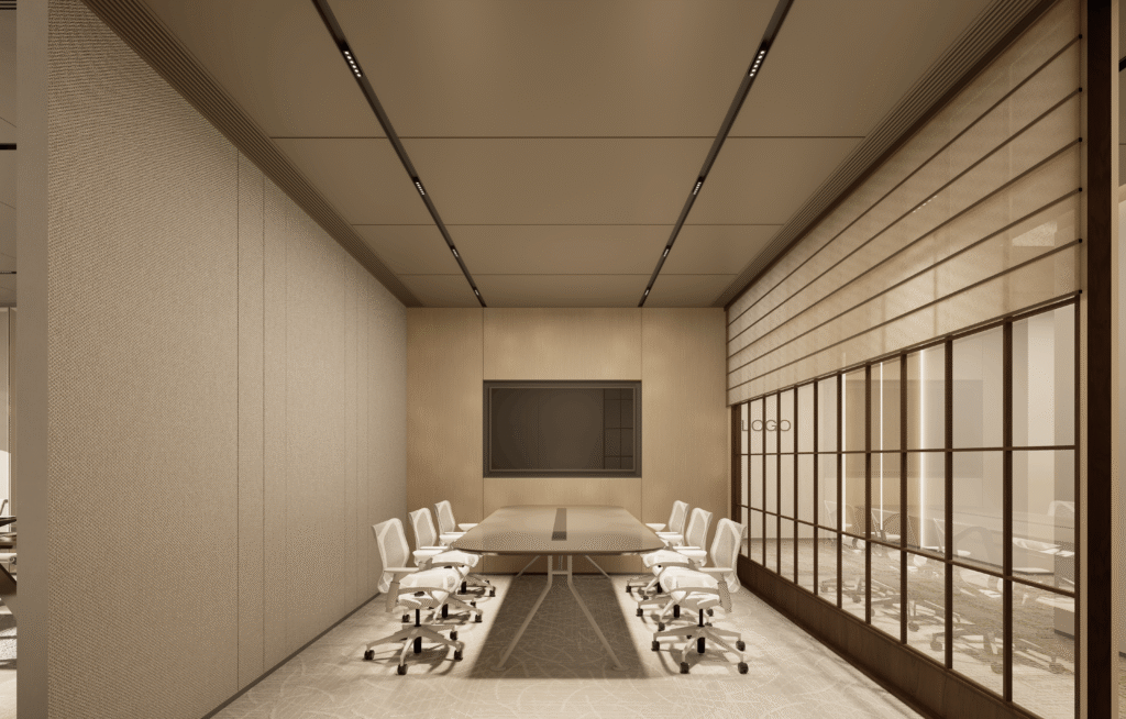 Complete flagship office design — boardrooms, executive suites, client-facing spaces with the highest specification materials, lighting design, and AV integration.