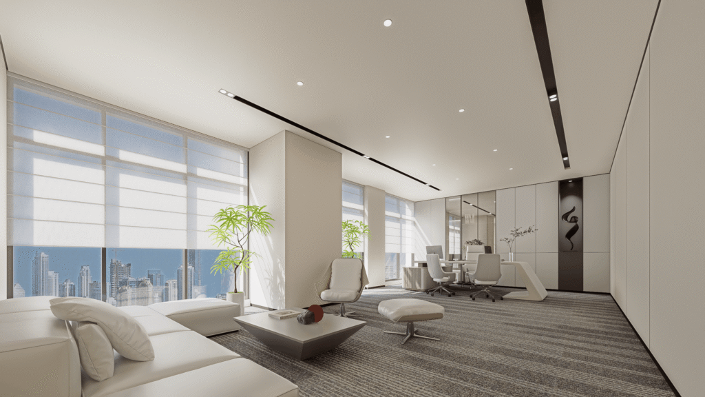 Full design with 3D renders, custom furniture, premium finishes, feature walls, and reception design. Ideal for offices that need to make a strong brand impression with clients.